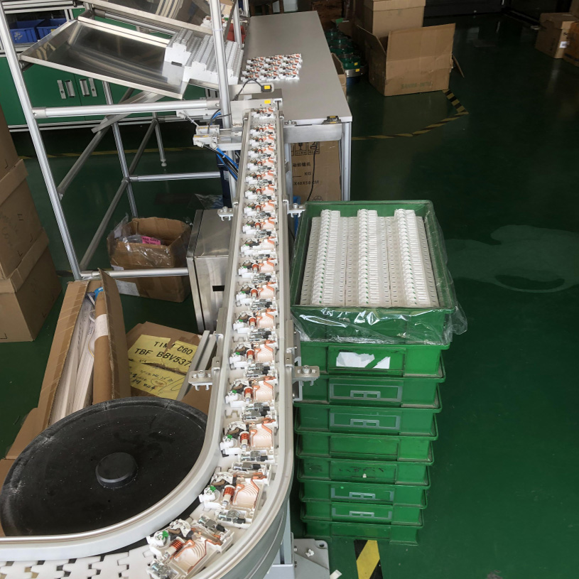 裝配線自動運行按工藝要求將配件: 1.機械組件 2.手柄彈簧 3.手柄 4.手柄閉合件4.手柄掛鉤 5.脫扣拉桿 6.滅弧室 等以上配件同步裝入殼體,全過程檢測 漏裝自動識別并剔除,觸摸屏文字提示,運行穩(wěn)定 操作簡單易學。